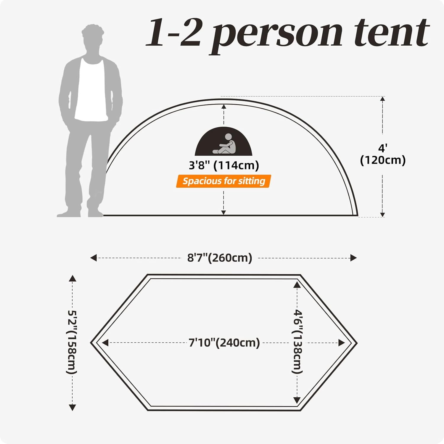 • Professional Largr 1 Person Tent Size: Inner tent(L95in x W54in x H45in), Outer tent: (L102in x W62in x H47in). This single person tent is long enough to enable the taller person to sleep in the tent comfortably; The longer tent also provides with extra space for the personal belongings like luggage, backpack, clothes, shoes, etc. It should be noted that trekking pole in the picture is not included in the tent set.