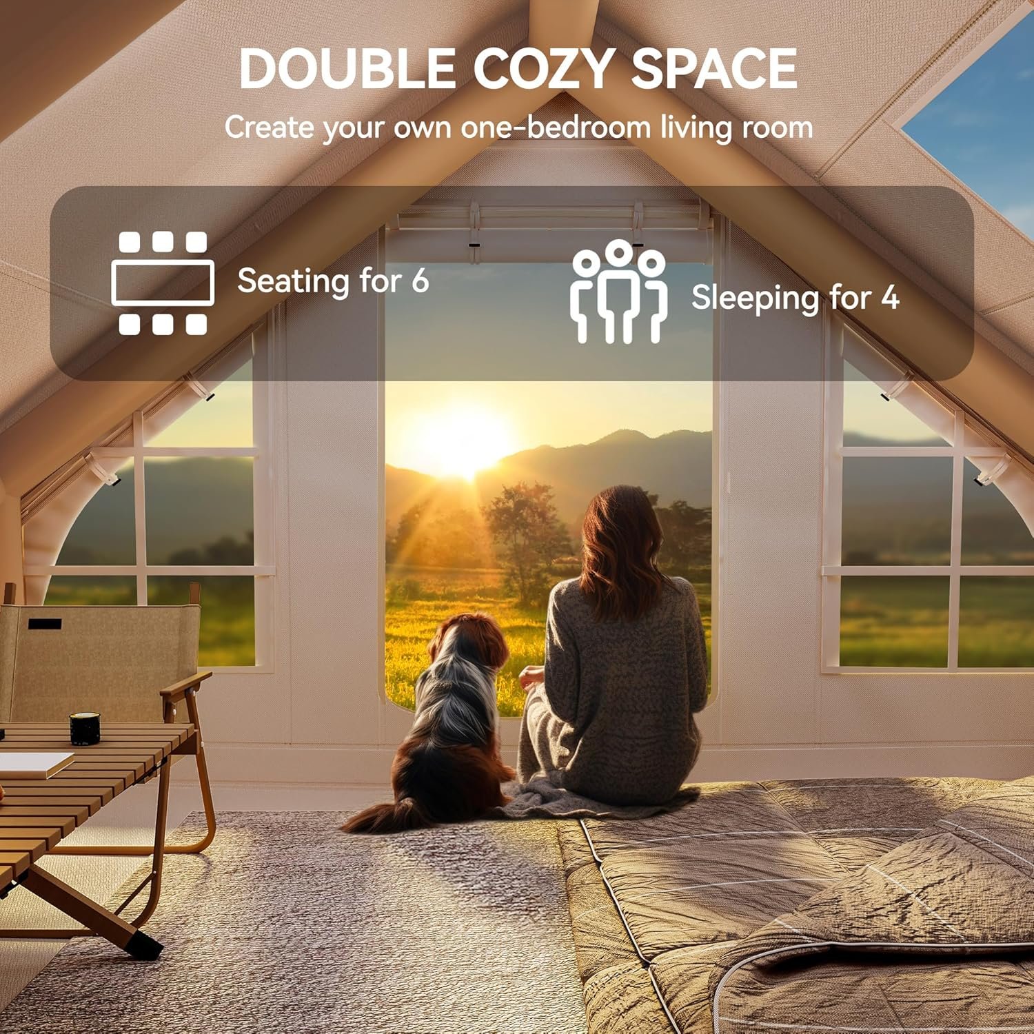 - WATERPROOF & WINDPROOF: The glamping tent is made using 400D Oxford cloth to facilitate a breathable interior without feeling stuffy; The surface rainproof rating of PU5000 provides effective protection against rain and water infiltration; Enjoy balanced breathability and waterproofness for an optimal camping experience